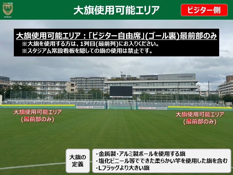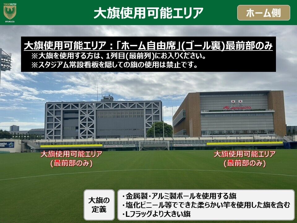 大旗(金属製・アルミ製ポールを使用する旗、塩化ビニール等でできた柔らかい竿を使用した旗を含む)・Lフラッグより大きい旗の使用は、ホーム自由席(ゴール裏)またはビジター自由席の最前部のみ使用可能です。