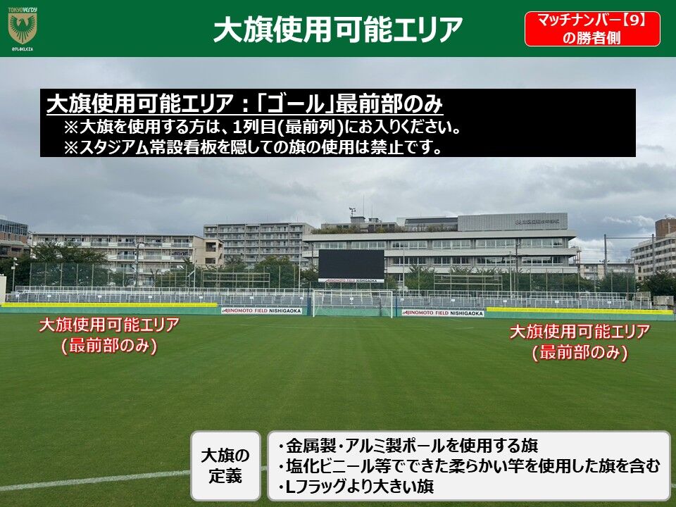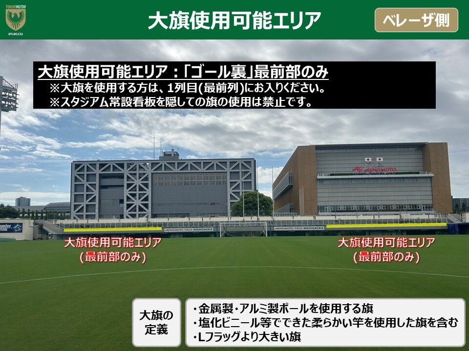 大旗(金属製・アルミ製ポールを使用する旗、塩化ビニール等でできた柔らかい竿を使用した旗を含む)・Lフラッグより大きい旗の使用は、ホーム自由席(ゴール裏)またはビジター自由席の最前部のみ使用可能です。
