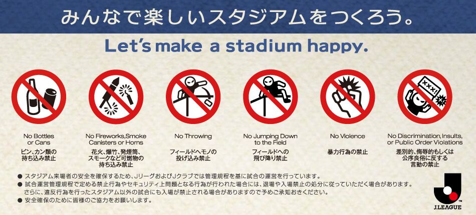 スタジアムに訪れたファン・サポーター全員が、気持ちよく楽しい時間・空間を過ごせるよう、皆様のご理解とご協力をお願いします。