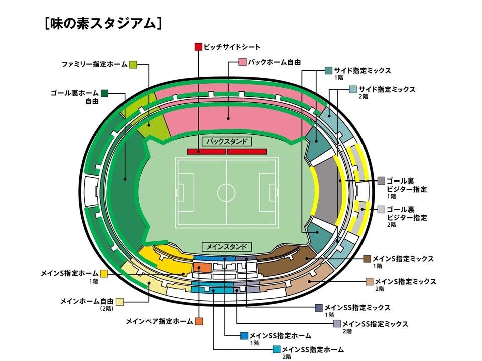 特に、中央ブロック柱番号56〜58付近や各ブロックの最前列(赤色のエリア)は、より熱く応援される方が集まるエリアとなります。