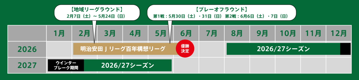 2026年よりJリーグはシーズン移行(秋春制移行)を実施。2026年2月から6月に開催される特別大会を『明治安田J1百年構想リーグ』として開催します。