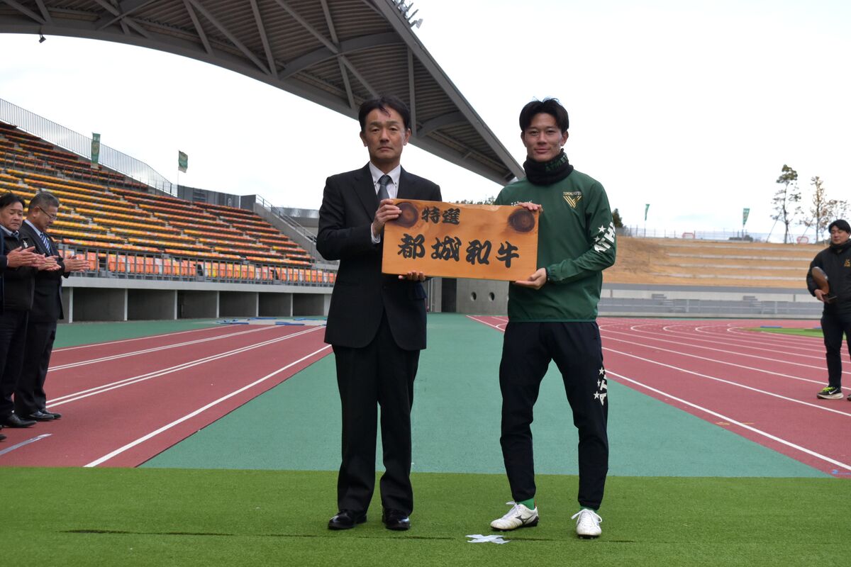 都城市 吉永利広 副市長より歓迎のご挨拶をいただいたほか、都城市の方々より地元の地場産品を贈呈いただきました。