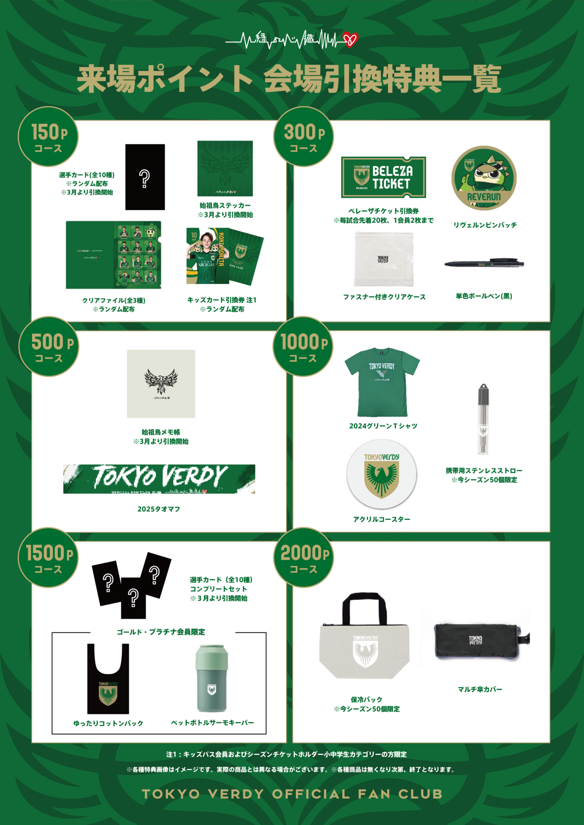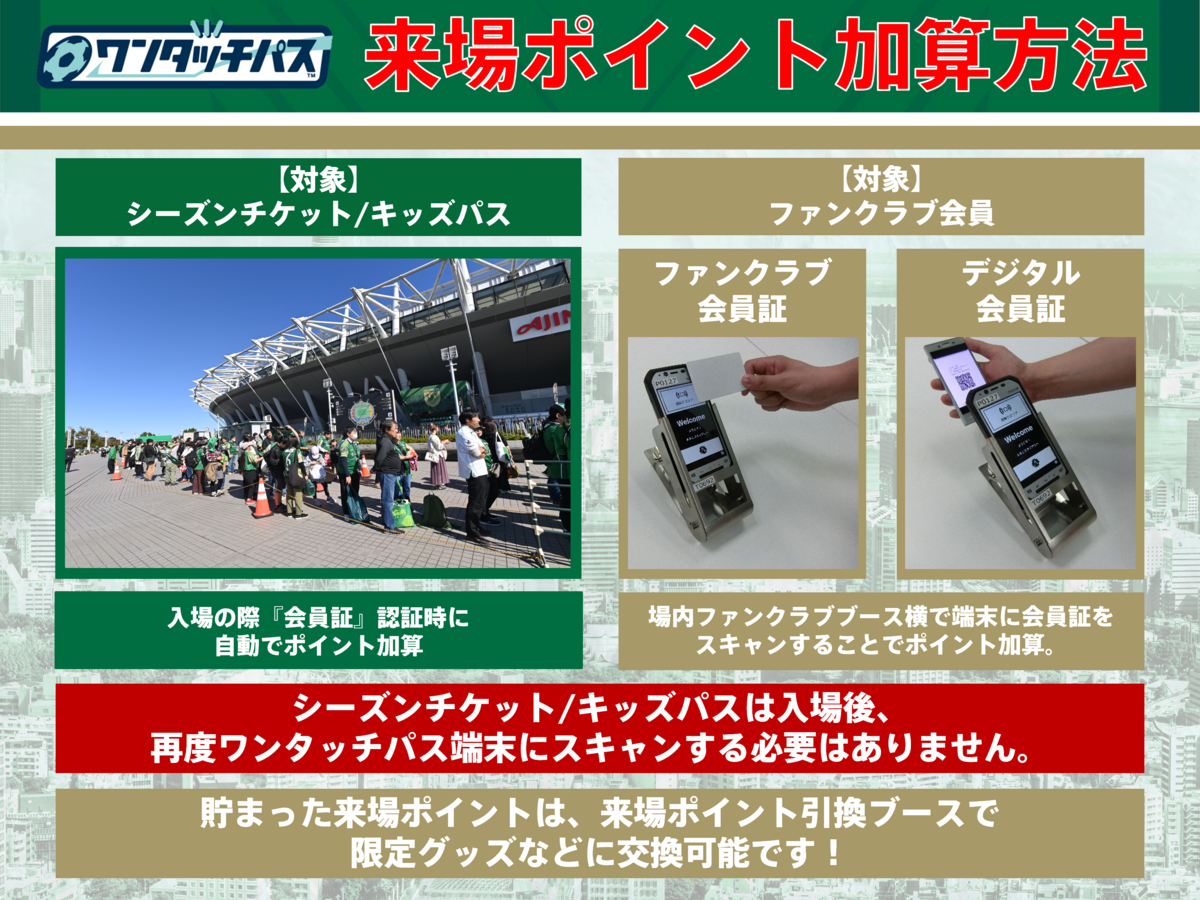東京ヴェルディシーズンチケット、公式ファンクラブ『緑の心臓』およびキッズパスにご入会の方は、試合会場にご来場いただくと来場ポイントが付与されます。