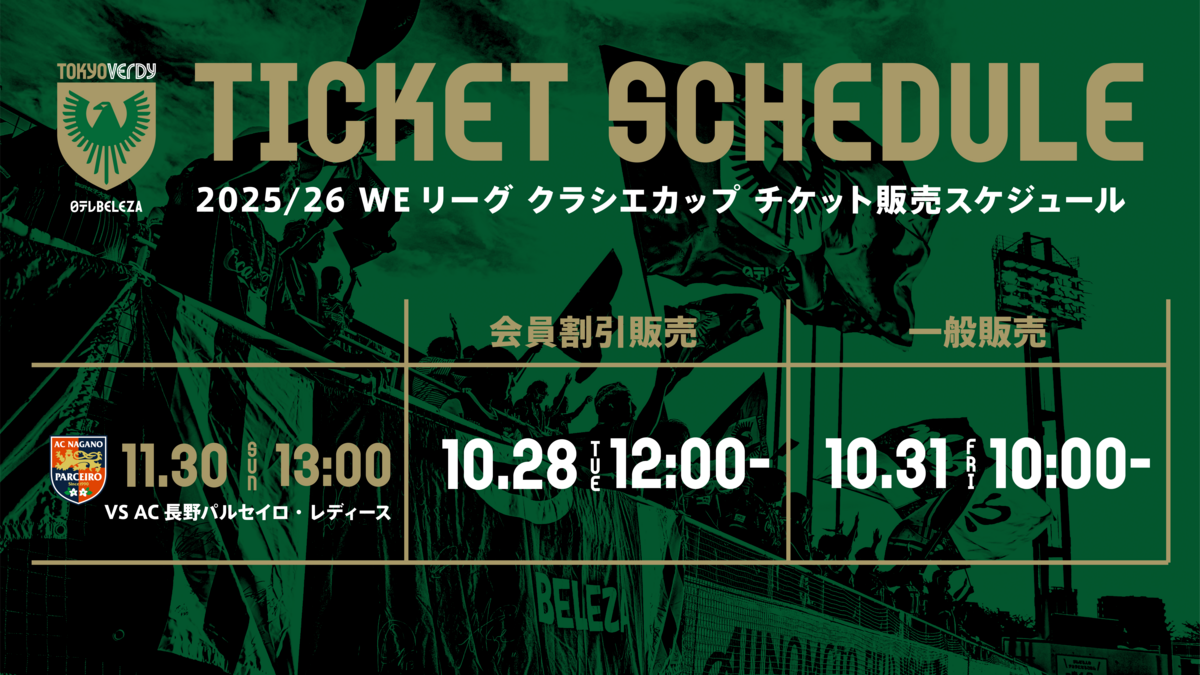 日テレ・東京ヴェルディベレーザでは、2025/26 WEリーグ クラシエカップ グループステージ 第2節 11月30日(日) AC長野パルセイロ・レディース戦のチケットを以下のとおり販売します。