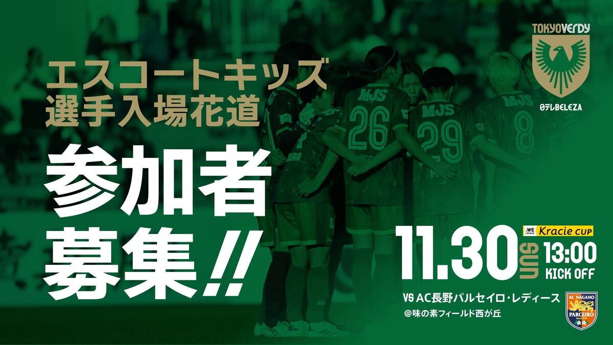 11月30日(日)AC長野パルセイロ・レディース戦にて、日テレ・東京ヴェルディベレーザの選手と一緒にピッチに入場できる小学生限定『エスコートキッズ』、中学生以上の方限定イベントとして選手入場を盛り上げる『選手入場花道』の参加者を募集します。