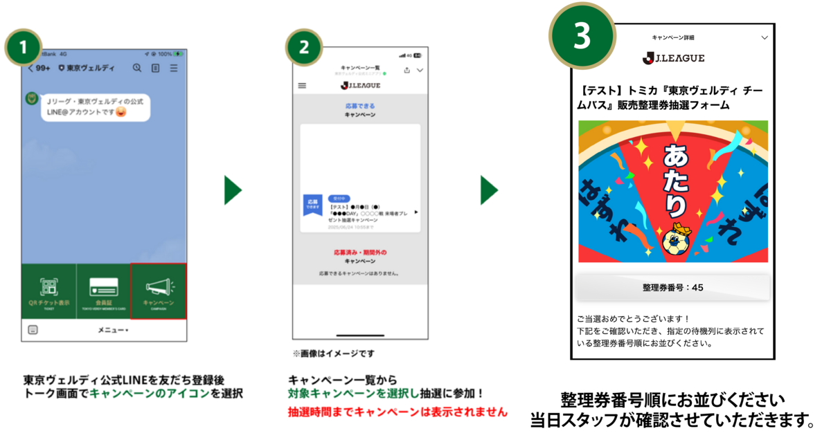 ・東京ヴェルディ公式LINEのトーク画面『キャンペーン一覧』から、対象キャンペーンを選択し、抽選に参加