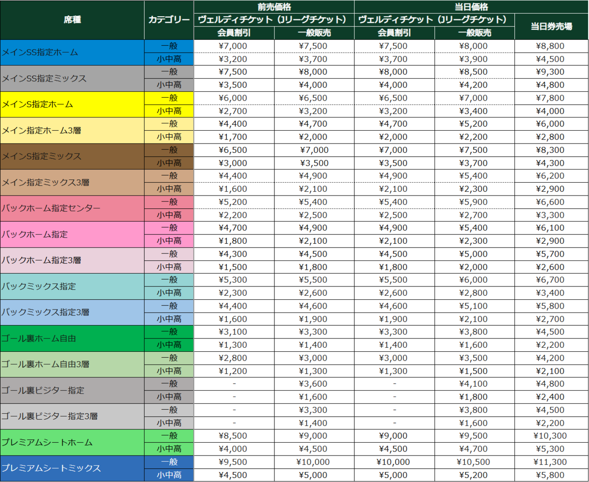 | ゴール裏ホーム自由 | 一般 | 3,100円 | 3,300円 | 3,300円 | 3,800円 | 4,500円 |