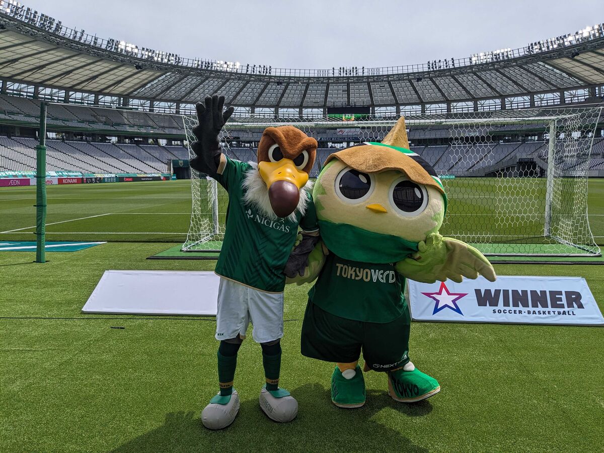 試合前のスタジアムでマスコットキャラクターと一緒に写真撮影!