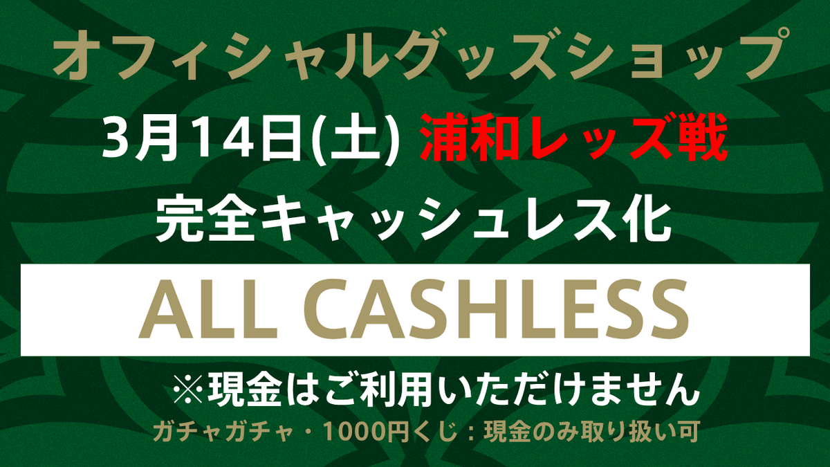 3月14日(土)浦和レッズ戦では、オフィシャルグッズショップのお支払い方法をキャッシュレス決済のみとさせていただきます。現金での決済ができませんので、あらかじめご了承の上、ご準備をお願いします。