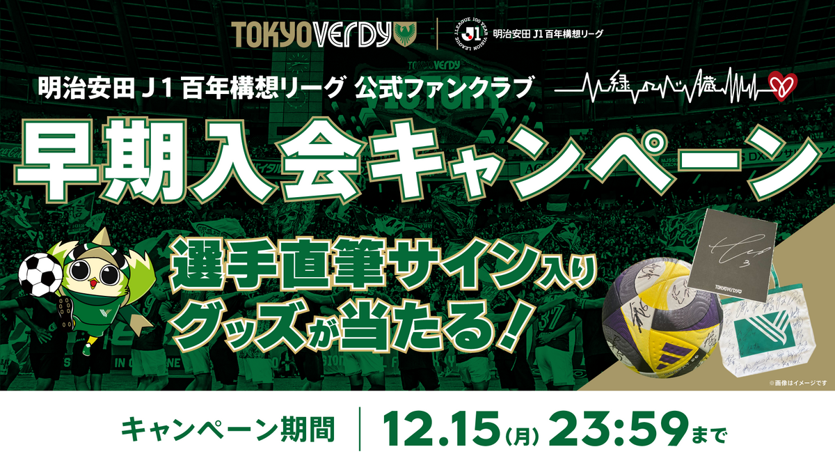 このたび、東京ヴェルディでは明治安田J1百年構想リーグ 公式ファンクラブ『緑の心臓』早期入会キャンペーンを実施します。
