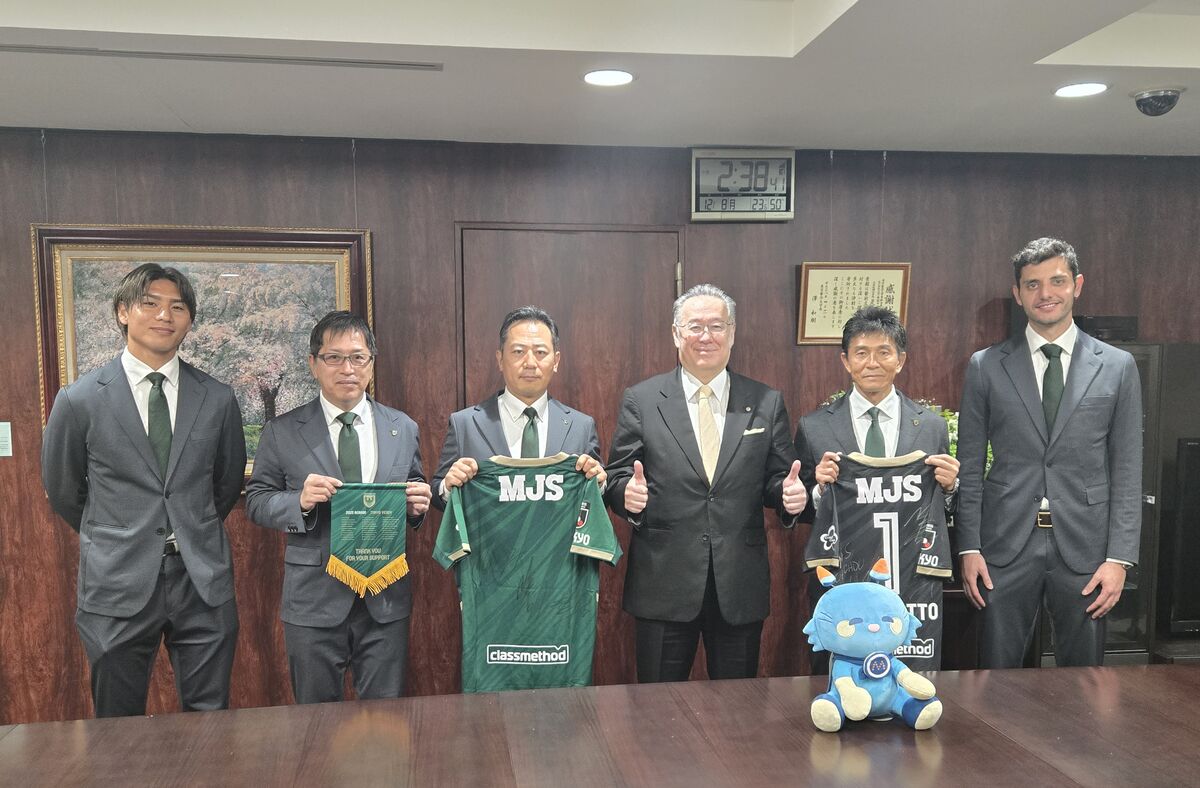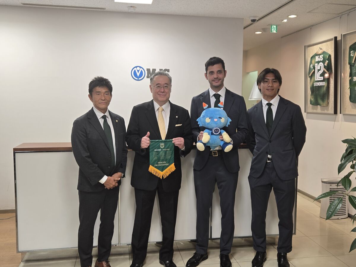 12月8日(月)、中村考昭 代表取締役社長、栗田大輔 代表取締役副社長、城福浩 監督、マテウス 選手、稲見哲行 選手が株式会社ミロク情報サービスを表敬訪問しました。