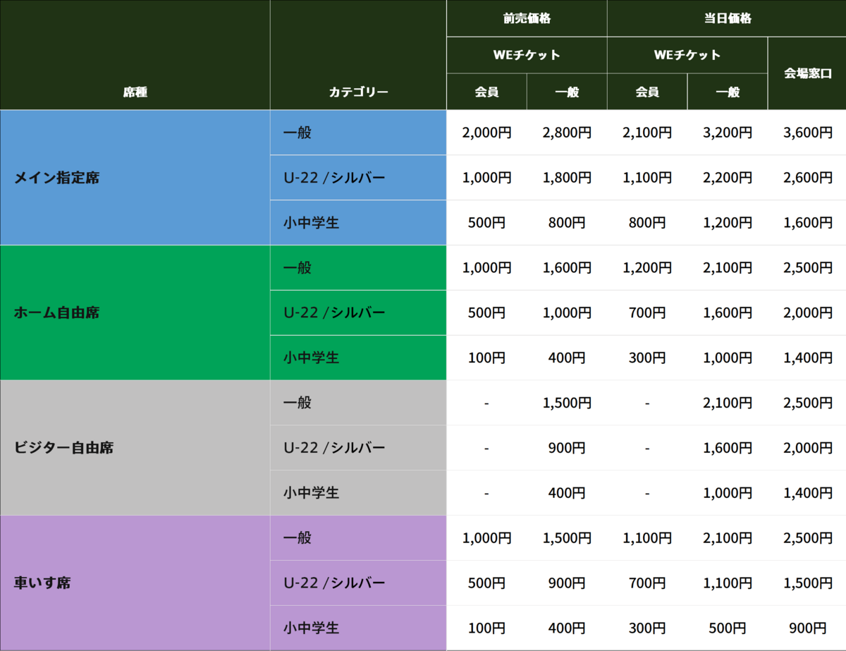 | ビジター自由席 | 一般 | - | 1,500円 | - | 2,100円 | 2,500円 |
