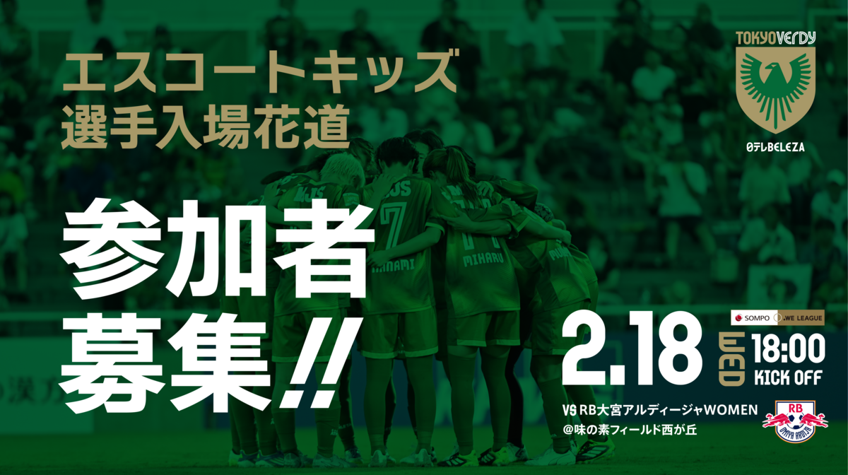 2月18日(水)RB大宮アルディージャWOMEN戦にて、日テレ・東京ヴェルディベレーザの選手と一緒にピッチに入場できる小学生限定『エスコートキッズ』、選手入場を盛り上げる『選手入場花道』の参加者を募集します。