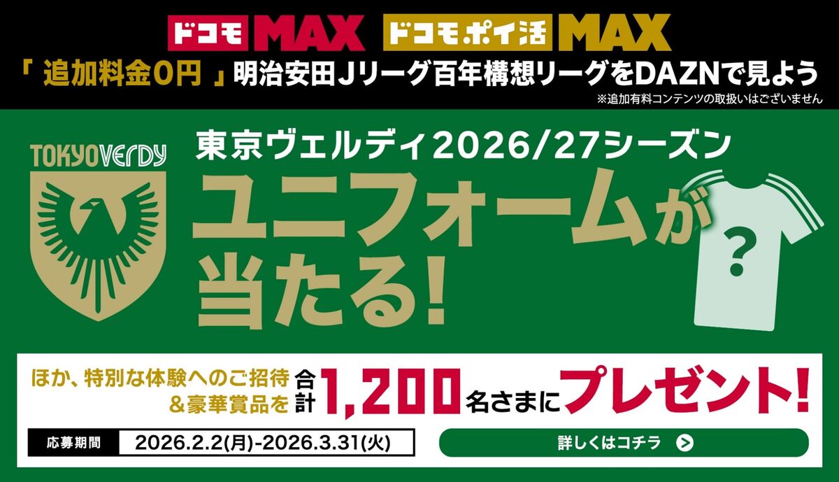 東京ヴェルディは、株式会社NTTドコモとの協業により、『ドコモ MAX』『ドコモ ポイ活 MAX』ご契約者様を対象としたキャンペーンを、以下の通り実施します。