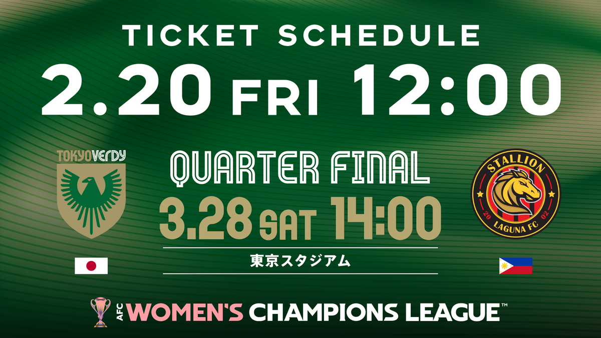 3月28日(土)AFC女子チャンピオンズリーグ2025/26 ノックアウトステージ 準々決勝 スタリオン・ラグナ戦のチケットを以下のとおり販売します。