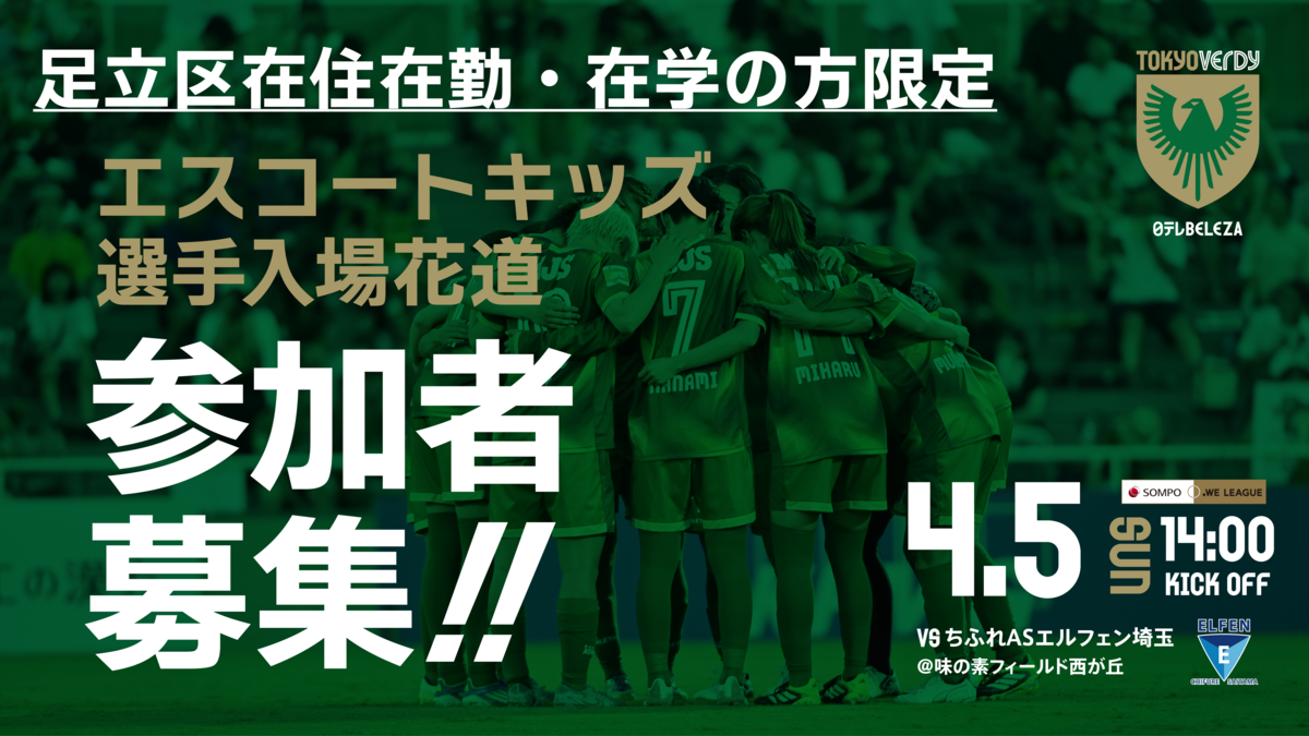 足立区に在住・在学の小学1〜6年生を対象に、日テレ・東京ヴェルディベレーザの選手と一緒にピッチに入場できる小学生限定『エスコートキッズ』、選手入場を盛り上げる『選手入場花道』の参加者を募集します。