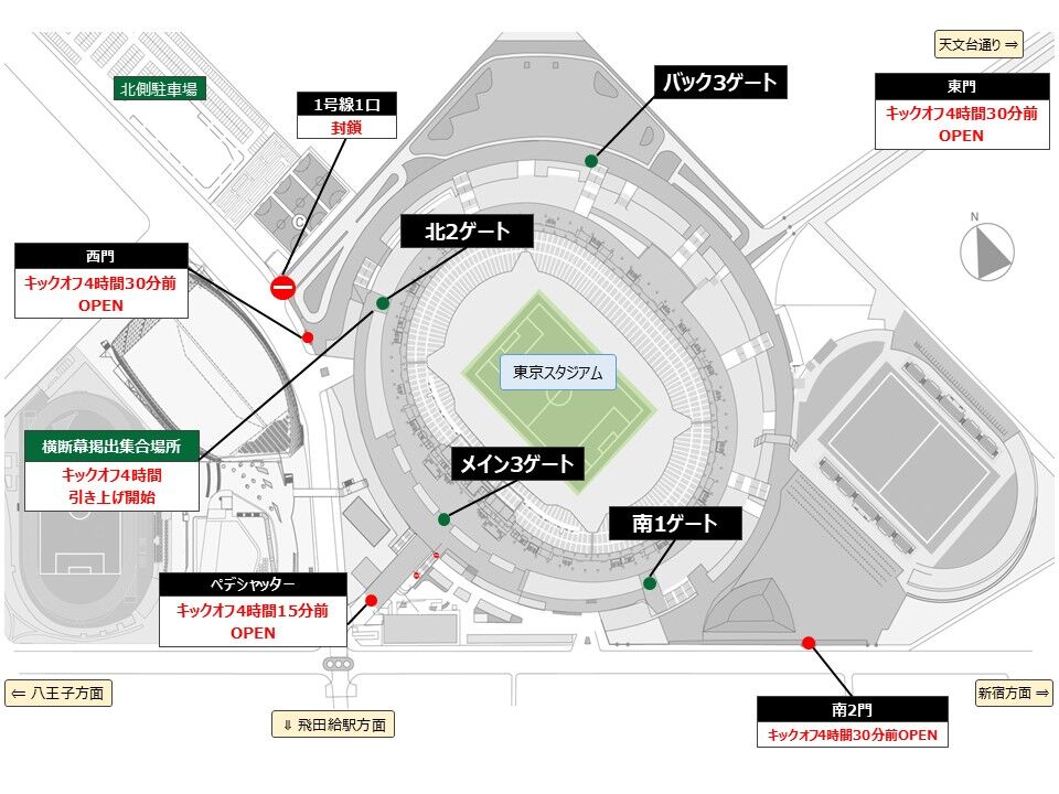 西門、東門、南2門は試合日のキックオフ4時間30分前に開門します。