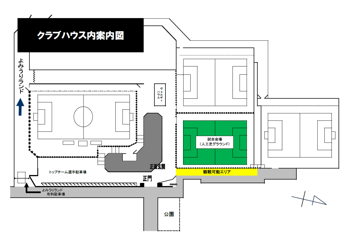 ・人工芝グラウンド東側の道路沿道にてご観戦いただけます。(下図の黄色エリア内)