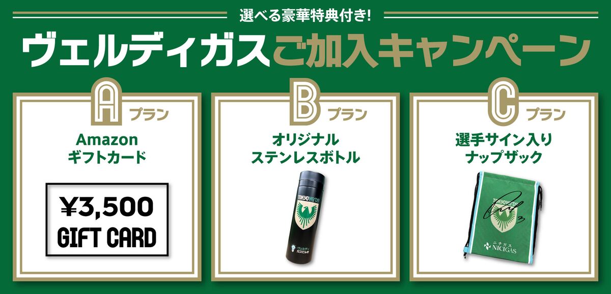 『ヴェルディガス』に新規にご加入いただいた方に、下記のA~Cプランの特典の中からひとつをプレゼントします。