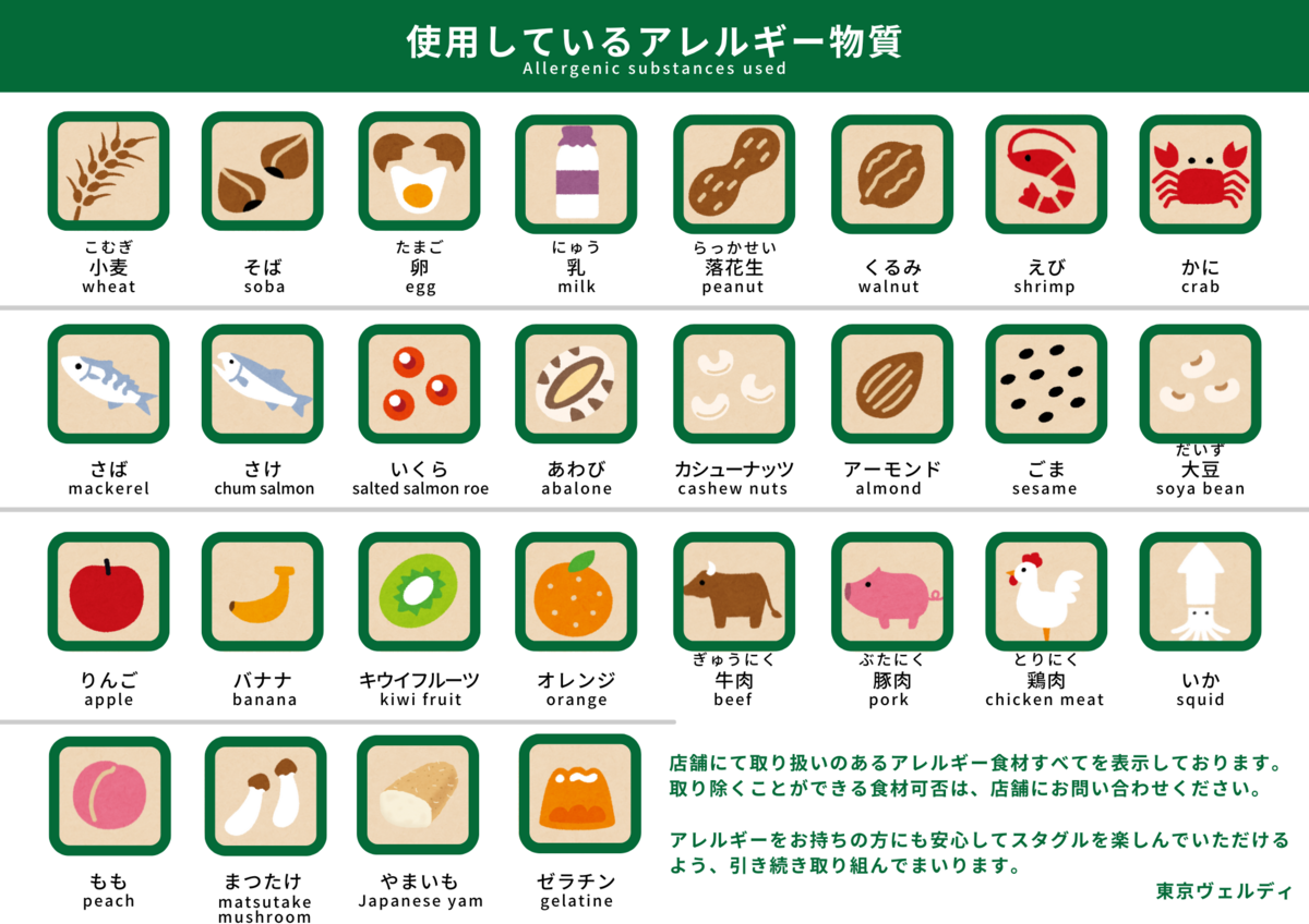 フードヴィレッジ、ファミリアランド、SWEETS ROADに出店する店舗を対象に、下記のアレルギー表示を統一して掲示しています。